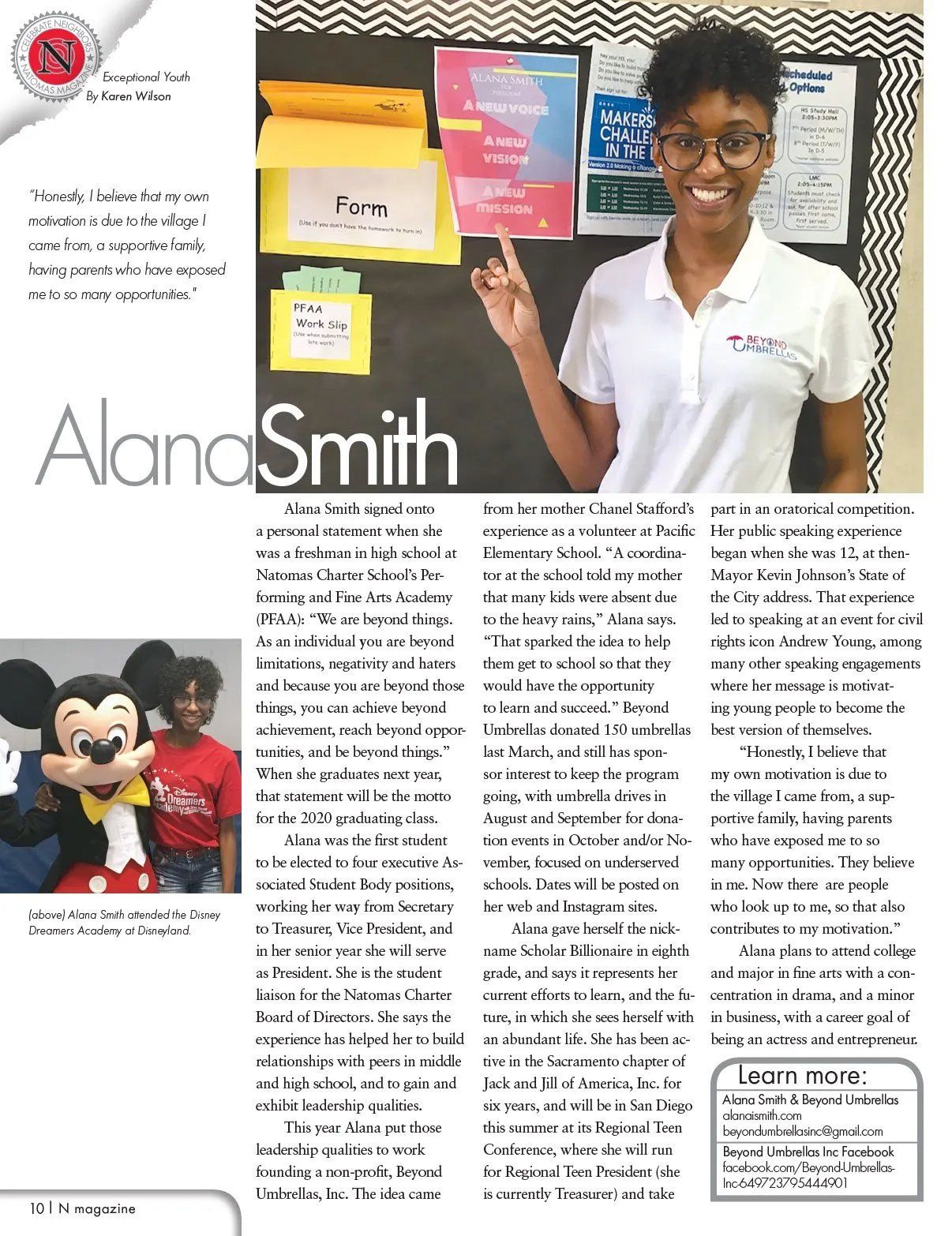 Alana I. Smith is a junior at Natomas Charter School Performing Fine Arts Academy and maintains over a 4.0 GPA. She was recently inducted into the National Honor Society and received the Sophomore Imagination Award, which is given to students who are original, creative thinkers. Alana demonstrates leadership in her school and local community. She was selected as a student liaison to the Natomas Charter School Board of Directors.
